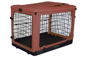 The Steel Crate has a heavy duty blow-molded plastic with steel inserts. Get the strength of steel and the look of blow-molded plastic. Rounded corners, no sharp edges, no scratching wood floors or snagging carpeted floors. Four doors: Top Door is molded plastic can be used as a table or grooming area. End doors on both ends offer accessibility from any angle. Large side door opens like a garage door keeping the door up and out of the way when open. Integrated wheels on one end and a pull handle on the other provide easy movement from room to room.