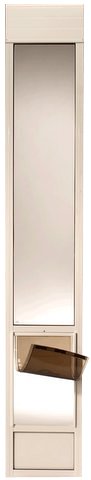 Unique self-adjusting design for an easy installation with no cutting required. Soft transparent all weather, energy conserving flap system reduces energy loss in winter and summer. Locking security cover may be installed on either side of the door. Adjustable height for 76 3/4 In. to 81 In. for regular patio doors and 93 In. to 96 In. for tall patio doors. Reversible lock for right or left sliding doors. Shatter resistant Tempered safety glass. Easy-to-follow installation manual